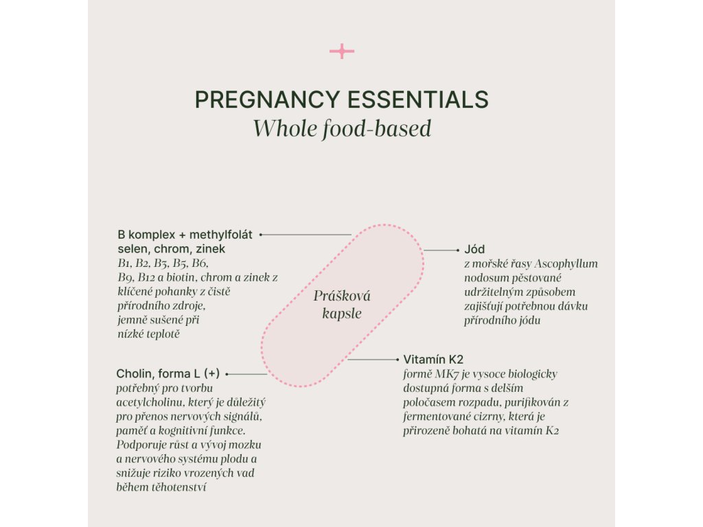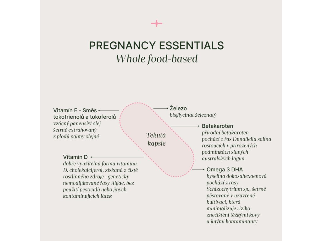 Esenciální nutrienty pro celkovou podporu organismu maminky a miminka v průběhu těhotenství i během kojení. Doplněk neobsahuje jen izolované molekuly vitamínů a minerálů, ale využívá komplexní přírodní zdroje, které přirozeně obsahují také další synergicky působící látky.